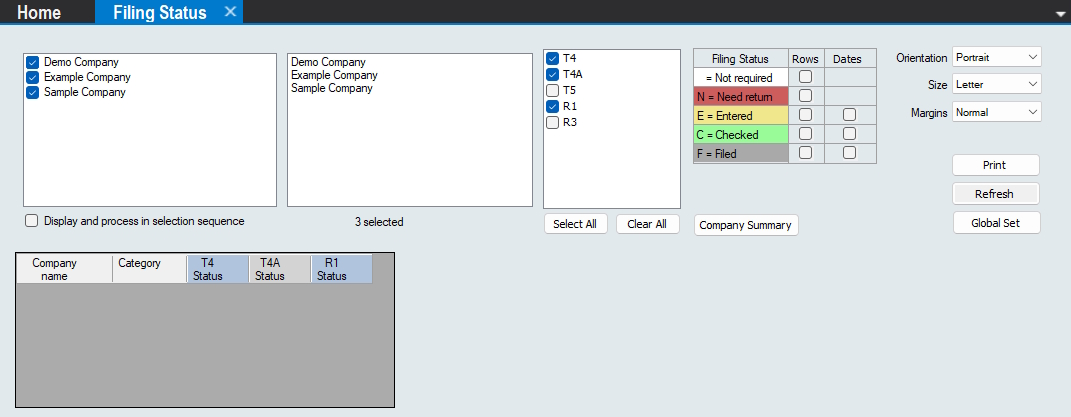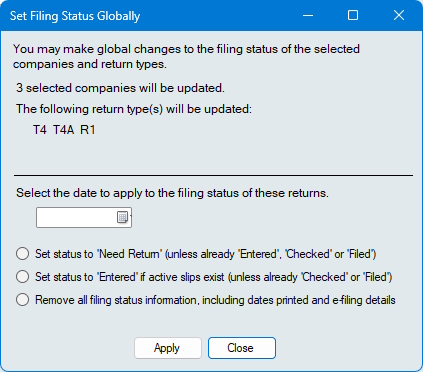 Global Set - Opens a dialog by which you can set the filing status for all selected return types for all selected companies