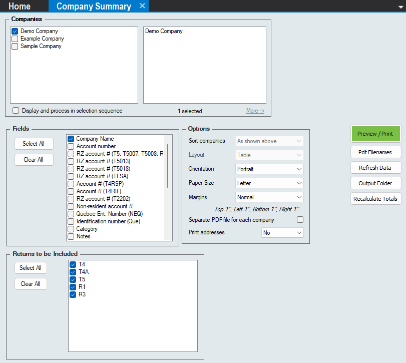 - All four report types have certain fields in common, such as Company Name and Tax Year, some fields are not available for the Company Summary Report (return type and return status) and the Edit List (return status)