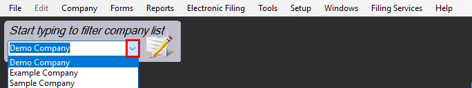 to display a list of all companies entered into the current data file; clicking on any company in the list will select it as the current company and that company’s name will now appear in the company box - With your mouse, highlight the name of the current company (“Demo Company”, blue in the image above) and start typing, eForms will display a list of companies that contain the typed characters; clicking on any company in the list will select it as the current company and that company’s name will now appear in the company box