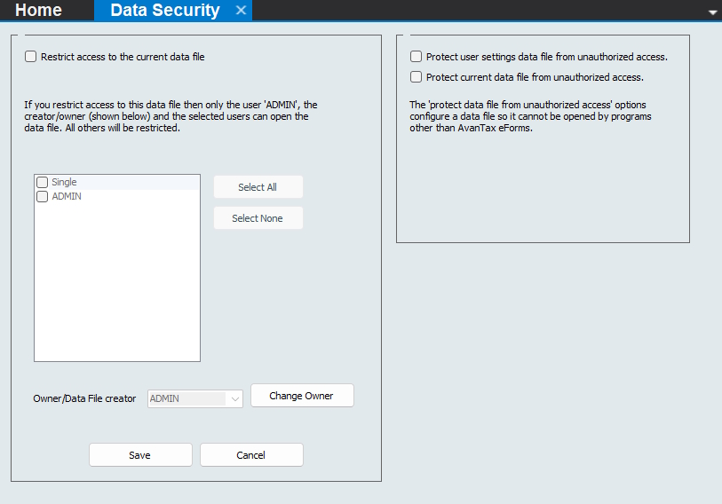 eForms Standard & eForms Enterprise have enhanced security which can restrict access to any data file, as well as the user database, to selected users. Use the ADMIN user account to set access restrictions for any data file, regardless of ownership. The owner of a data file, typically its creator, has the ability to set access restrictions for that data file. The ownership of any data file can be changed to enable any other user the ability to set access restrictions.
