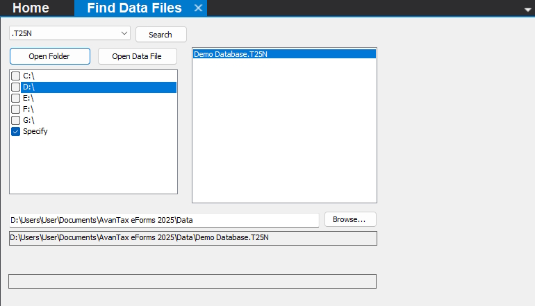 The Find data file tool will search all selected drives and storage locations to find data files for the specified year.