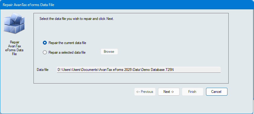Repair the current data file - Choose this option to repair the current data file.