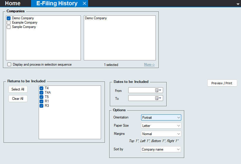 Use the E-Filing History Report to produce reports indicating slip types that have been electronically submitted to CRA or Revenu Québec, along with submission dates and CRA or Revenu Québec submission confirmations.