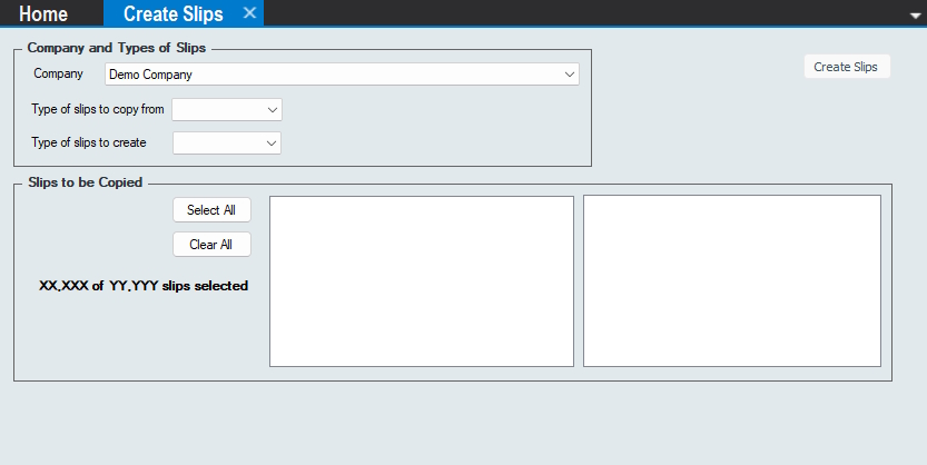 Type of slips to create - Use the drop-down box to select the type of slip to create from the existing data