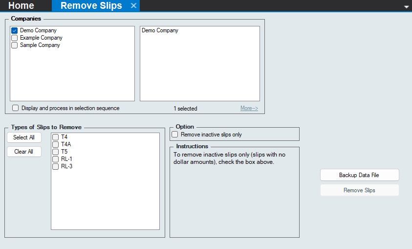 Remove Slips - Delete ALL slips of all selected return types for ALL selected companies in the current data file