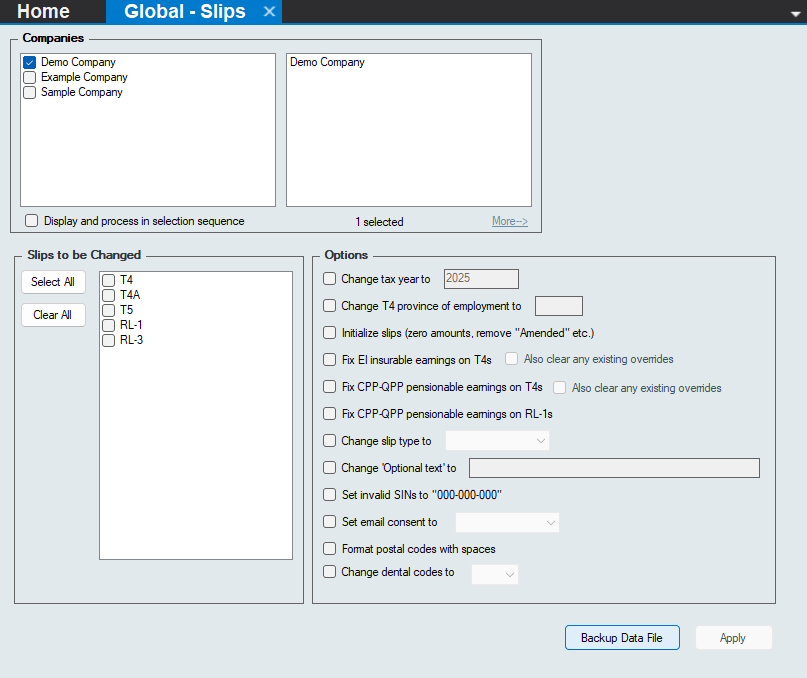 Apply - Apply the selected option to ALL slips of all selected return types for ALL selected companies in the current data file