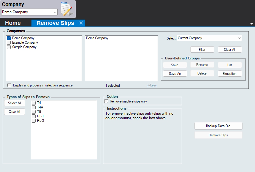 Remove inactive slips only - Tells eForms to only delete inactive slips, all other slips will remain in the data file. eForms defines an inactive slip as a slip where every currency field contains $0.00