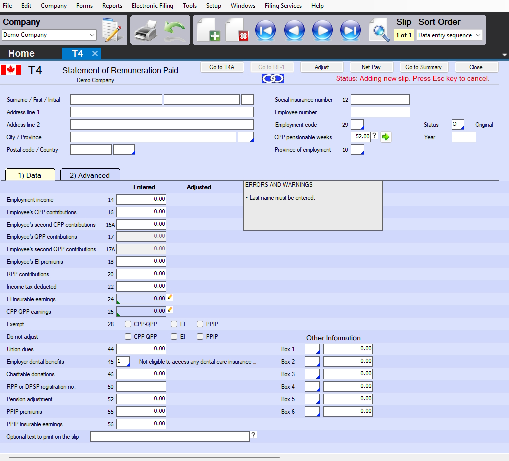 AvanTax eForms lets you delete slips individually (slip-by-slip) and globally. NOTE: Deleting slips is permanent! Once slips have been deleted, they cannot be reovered unless you have made a recent backup.