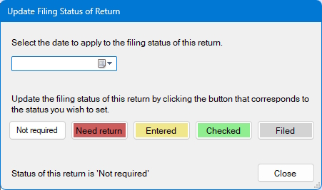 Filing Status - Displays a window where the filing status of the current return for the current company can be selected. Changes made to the filing status apply only to the current return for the current company.