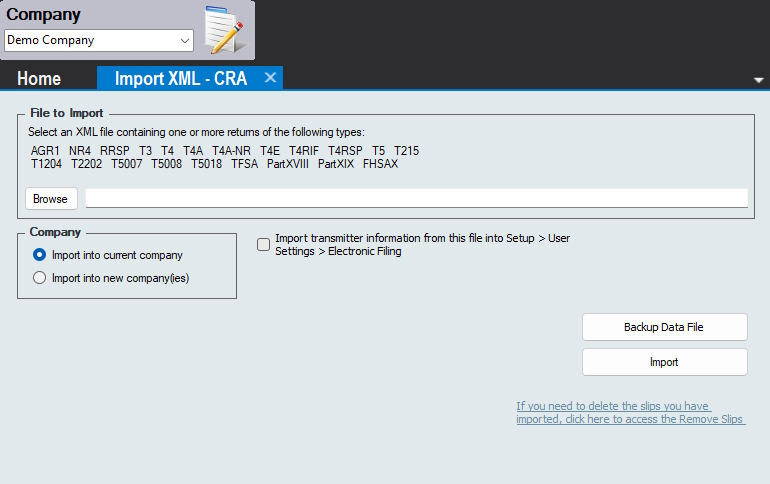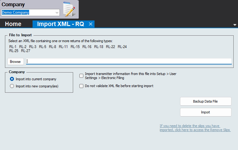 Import into New Company - Imports data from the CRA or Revenu Québec XML file into a new company, you will be prompted to enter a name for this company before the import begins