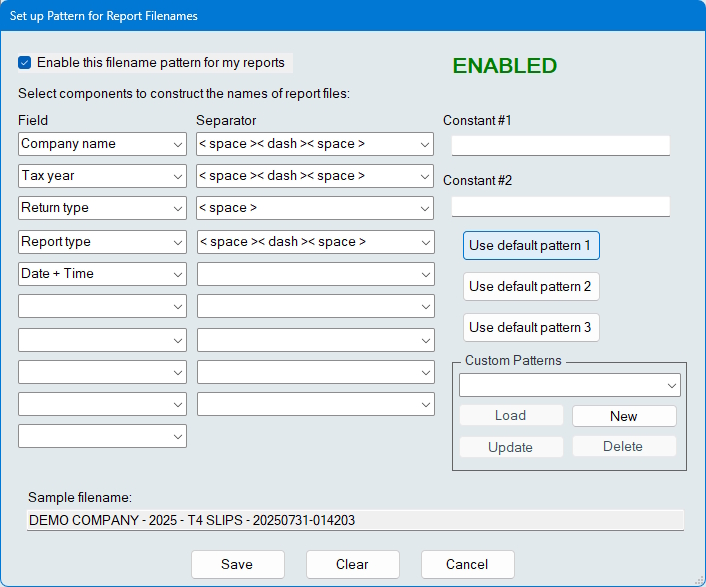 Filenames - Setup default filename patterns for eForms reports; three defauls patterns are provided, and you can also createa pattern to suit your needs