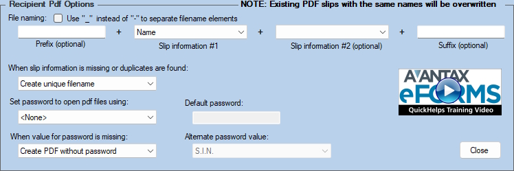 - Alternate password value - Lists data items unique to the recipient that may be used to protect the PDF file; available data items will vary according to the slips being prepared.