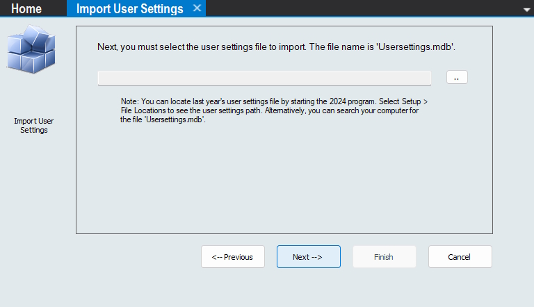 The second screen lets you specify the location of the file containing the 2025 eForms user settings; as well as giving instructions on how to locate this file.