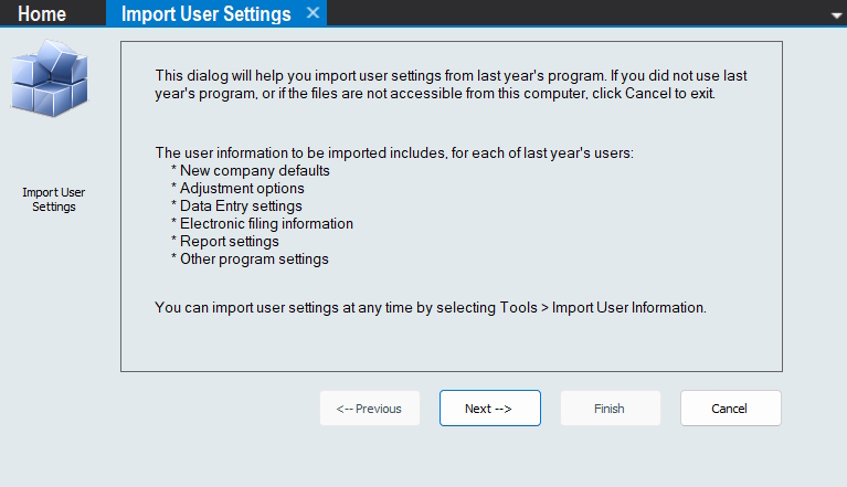 The first screen describes the user settings data that will be imported from 2025 eForms.