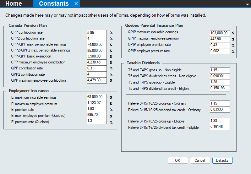 eForms comes preconfigured with the rates and constants set by legislation for 2026. Use this utility to edit the rates and constants as required to enable preparation of returns using 2027 rates and constants when eForms 2027 is not yet available, or to submit returns after a business closing midway through 2027.