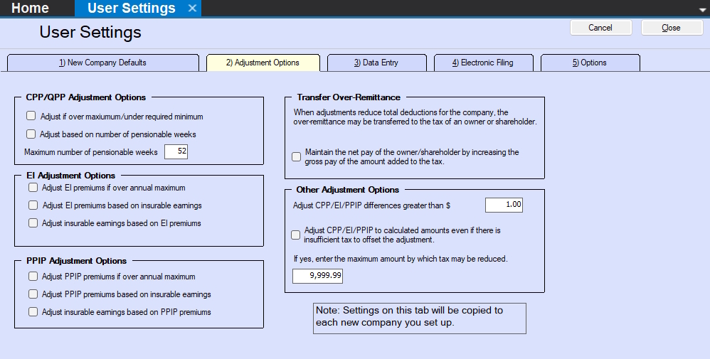 Adjust CPP/EI/PPIP differences greater than - Adjustments to CPP/QPP, EI or PPIP/QPIP will be made only if they exceed the value entered here. No adjustments will be made if the difference between the calculated amount and the entered amount for CPP/QPP, EI or PPIP/QPIP is less than or equal to this value and the unadjusted values will be reported. The default is $1.00.