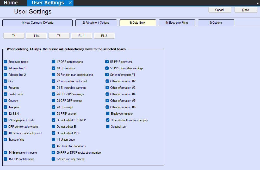 As you enter slip information and TAB from one field to the next, it may not be necessary to enter information into each field; some may be left blank or contain a default value. This page lets you place a check mark beside each box where you want the cursor to stop, and remove the check mark from beside any box where you do not wish the cursor to stop.