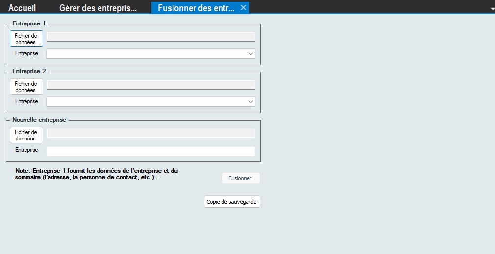 À partir du menu, utiliser : Fichier > Entreprise > Gérer des entreprises > Fusionner des entreprises