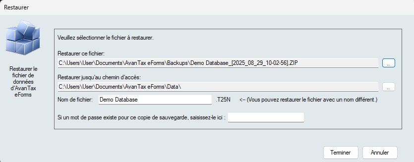 Une fois tous les paramètres configurés à votre satisfaction, cliquez sur le bouton “Terminer” pour restaurer votre fichier de données. Une fois le fichier de données restauré, vous pouvez l’ouvrir comme tout autre fichier de données eForms.