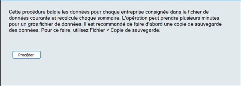 Démarrer - Cliquez sur ce bouton pour lancer la vérification de l’intégrité. eForms recalculera chaque sommaire pour chaque déclaration de toutes les entreprises dans le fichier de données actuel.