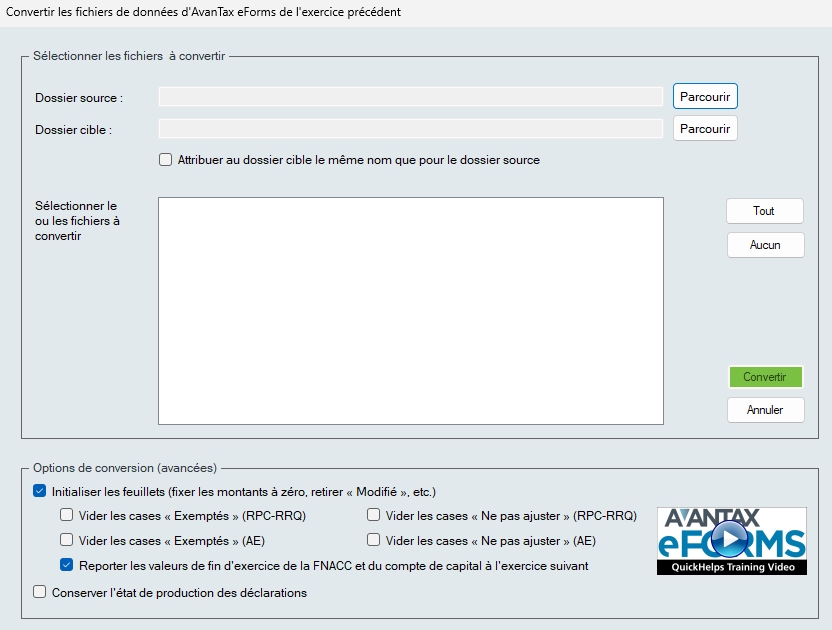 Cocher cette case obligera eForms à utiliser le dossier source comme dossier de destination. Les fichiers de données 2025 ne seront pas écrasés; un nouveau fichier de données au format 2026 sera créé à partir du fichier de 2025. Des fichiers de données de plusieurs années peuvent coexister sans problème dans un seul dossier.