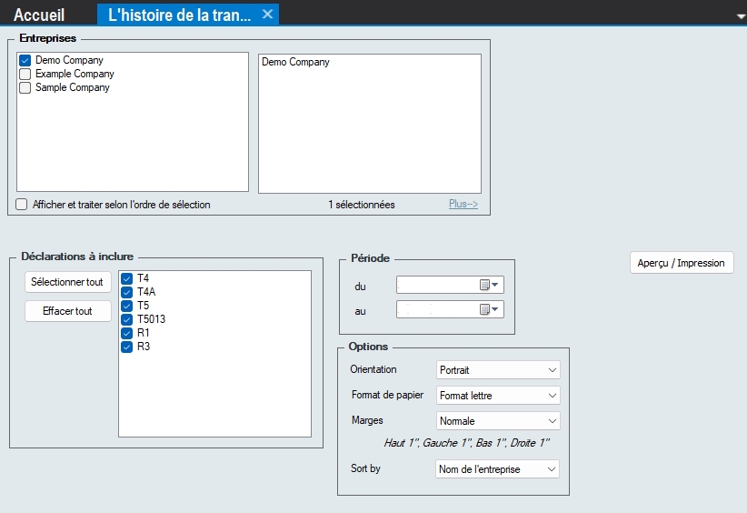 Utiliser l’Historique des transmissions par voie électronique pour produire des rapports indiquant les types de feuillet transmis électroniquement à l’ARC ou à Revenu Québec, ainsi que les dates de transmission et les confirmations de transmission de l’ARC ou de Revenu Québec.