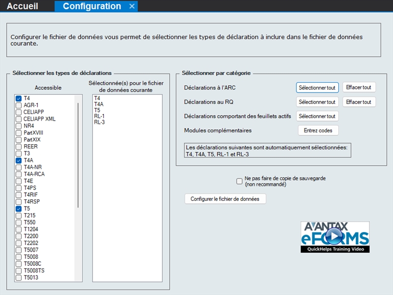 Cochez ou décochez la case appropriée pour sélectionner ou désélectionner une déclaration. Vous pouvez aussi sélectionner ou désélectionner des types de déclaration par catégorie pour l’ARC et Revenu Québec, ou sélectionner tous les types de déclaration pour lesquels des feuillets ont été saisis. Les cinq formulaires ci-dessous sont toujours actifs dans toute installation d’eForms et ne peuvent pas être désactivés :