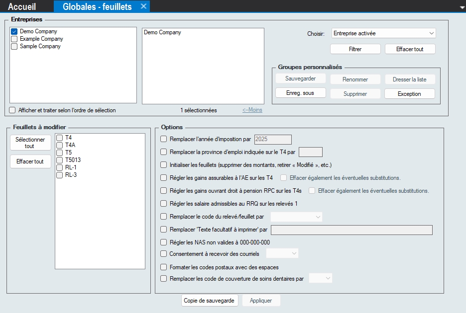 Appliquer - Appliquer l’option sélectionnée à TOUS les feuillets de tous les types de déclaration sélectionnés pour TOUTES les entreprises sélectionnées dans le Fichier de données actuel