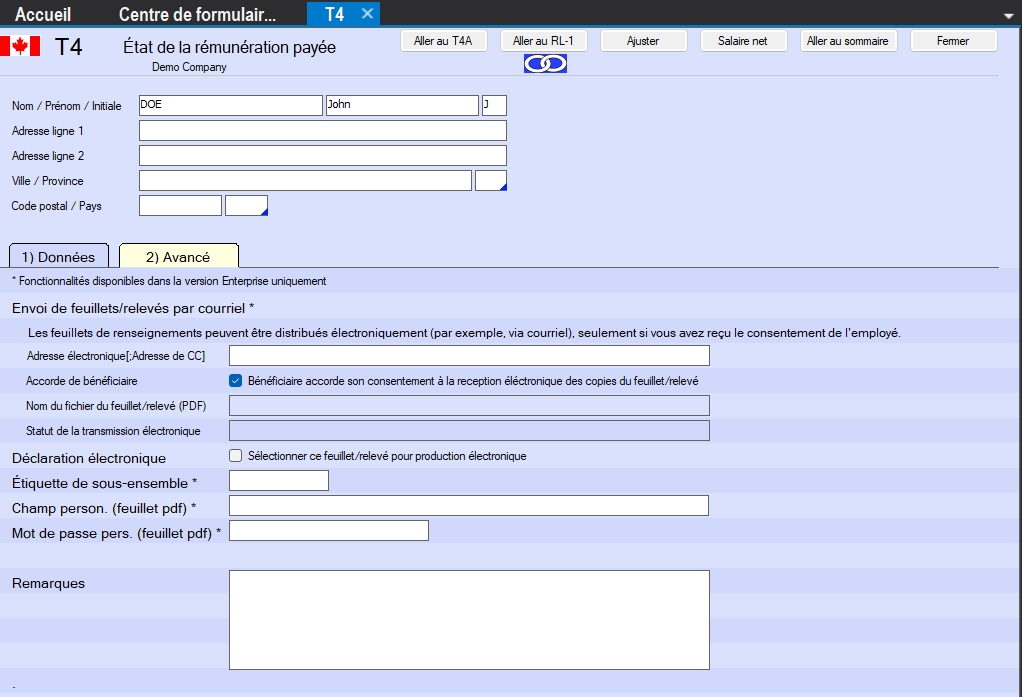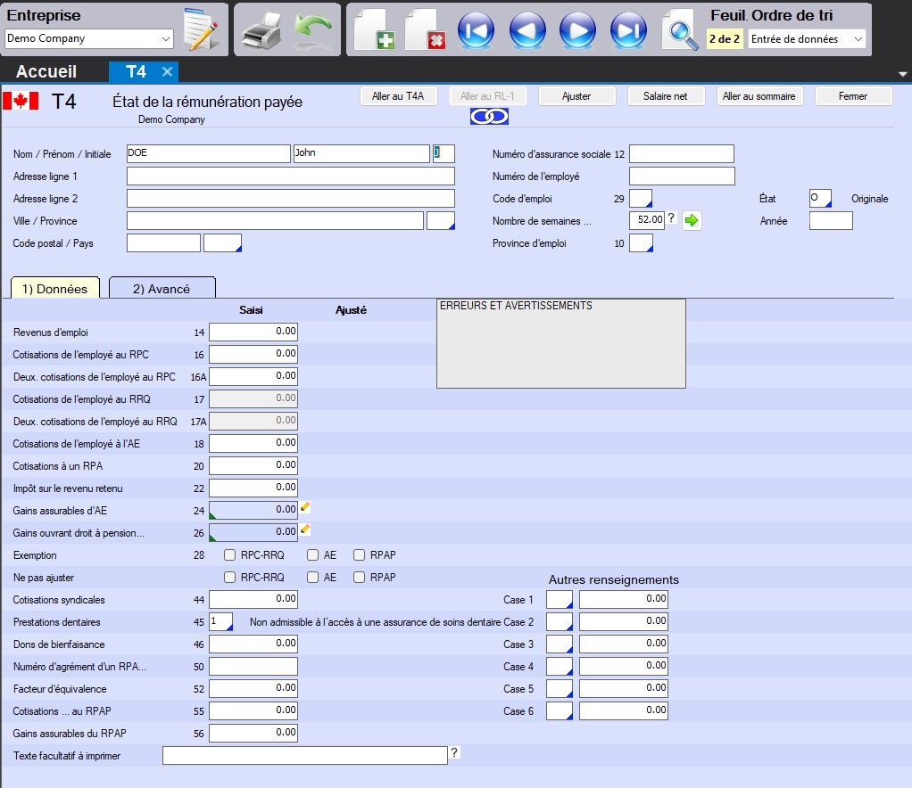 Un exemple de l’écran de saisie des données du feuillet T4 est présenté ci-dessous.