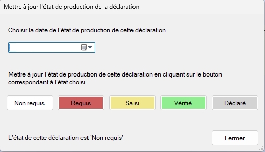 Statut de production - Affiche une fenêtre où vous pouvez sélectionner le statut de production de la déclaration courante pour l’entreprise actuelle. Les changements apportés au statut de production s’appliquent uniquement à la déclaration courante de l’entreprise actuelle.