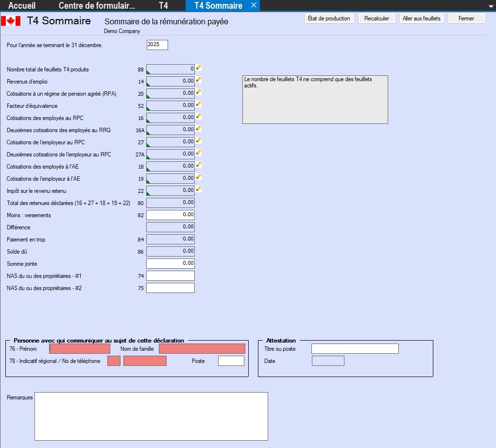 Un exemple de l’écran de saisie des données du sommaire T4 est présenté ci-dessous.
