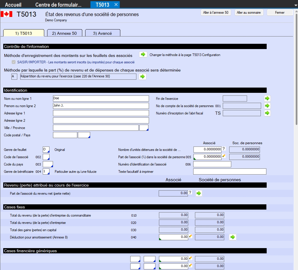 L’écran de saisie des données pour chaque formulaire d’eForms comporte un champ de saisie pour chaque case des formulaires imprimés correspondants (ainsi que des champs de contrôle utilisés par eForms). Reportez-vous aux guides fournis par l’ARC ou Revenu Québec pour obtenir des renseignements et des règles concernant la façon de remplir tout formulaire. Un exemple d’écran de saisie des données pour un feuillet T5013 (eForms Standard et eForms Enterprise) est présenté ci-dessous à titre d’illustration.