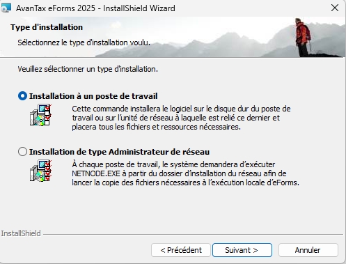 Sélectionnez Poste de travail dans la fenêtre Sélectionner le type d’installation si vous installez eForms individuellement sur chaque poste de travail. Cela installera le programme sur tout disque dur local ou lecteur réseau accessible au poste et placera tous les fichiers et ressources de soutien requis par le programme sur le disque dur du poste de travail. C’est la meilleure option si vous n’avez pas de réseau ou si vous utilisez eForms sur un petit nombre de postes de travail. REMARQUE : n’utilisez pas l’installation poste de travail pour installer AvanTax eForms dans un environnement Terminal Server. Voir ci‑dessous pour les détails.