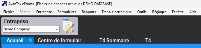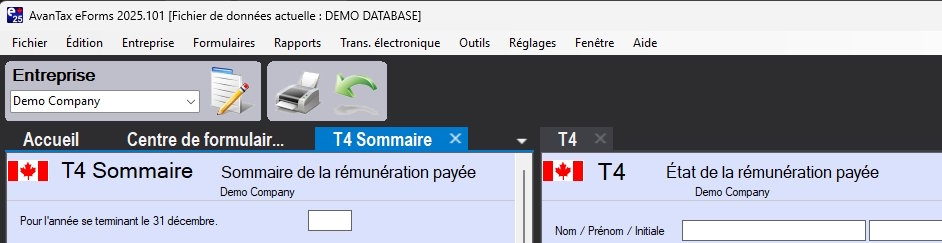 Une fois l’écran scindé, les formulaires peuvent être déplacés à votre guise en cliquant sur l’onglet du formulaire et en le faisant glisser à l’endroit souhaité. L’écran peut être scindé davantage pour accueillir d’autres formulaires au besoin. Plusieurs formulaires peuvent être ouverts dans n’importe quel volet (voir l’exemple ci-dessus où des onglets pour l’écran d’accueil, le centre de formulaires et un sommaire T4 s’affichent à gauche, tandis qu’un feuillet T4 s’affiche à droite). La fermeture du dernier onglet dans un volet ramène les onglets restants en mode plein écran.