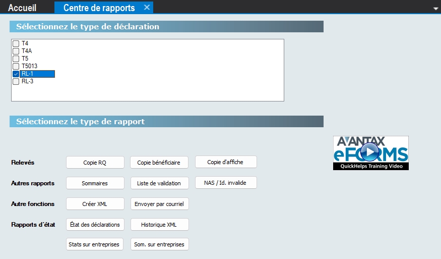 Le centre de rapports est l’emplacement central pour préparer tous les feuillets, les sommaires et les transmissions XML (ainsi que plusieurs rapports internes d’eForms) à partir des données du fichier de données en cours. Les rapports qui ne figurent pas dans le centre de rapports sont accessibles à partir du menu Rapports.