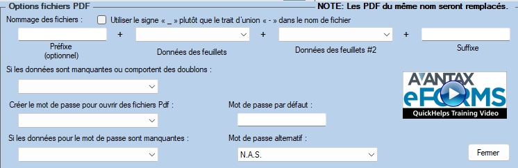 - Valeur de mot de passe de rechange - Dresse une liste d’éléments de données propres au destinataire qui peuvent être utilisés pour protéger le fichier PDF; les éléments disponibles varient selon les feuillets préparés.