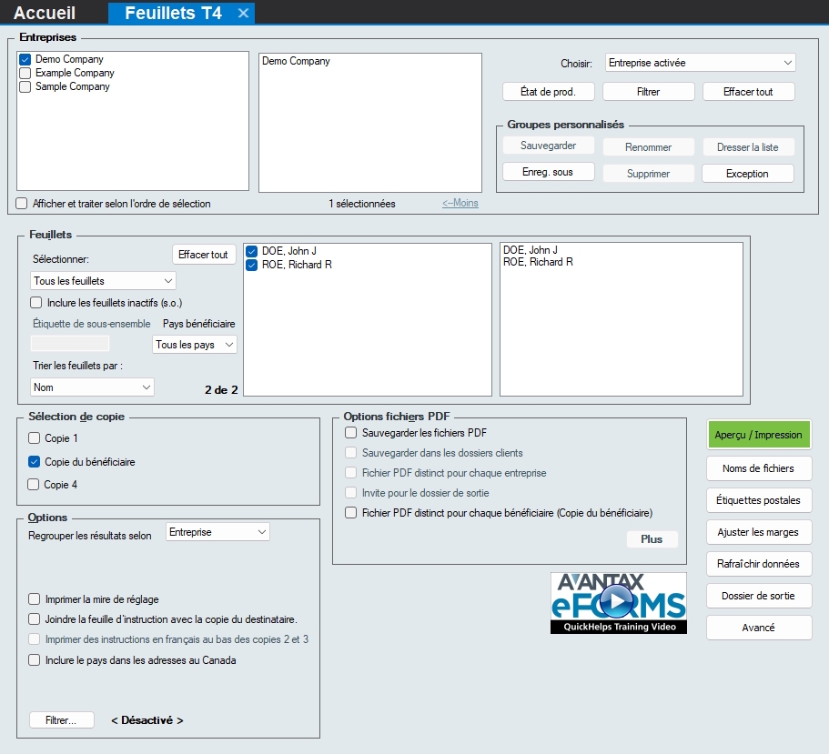 Grouper la sortie par - Choisir de grouper les feuillets par numéro de copie ou par entreprise