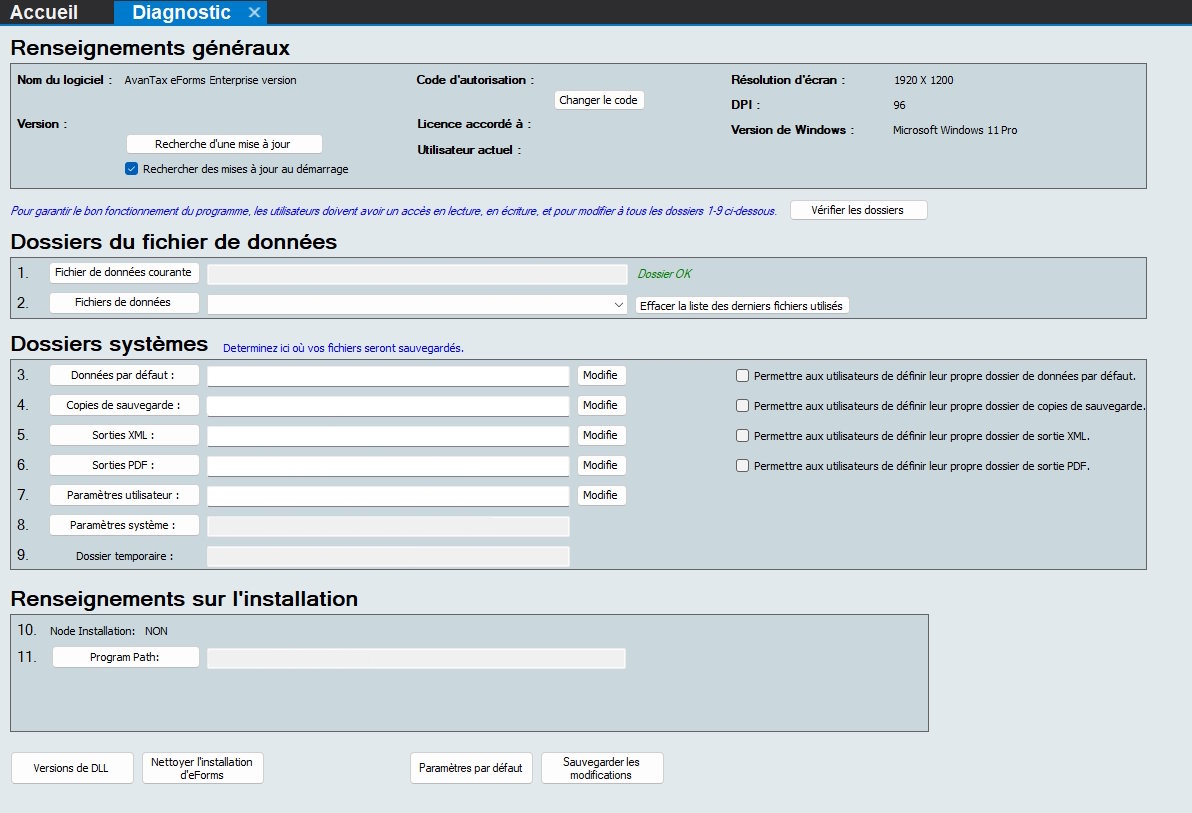 Comme un problème courant dans les environnements multiutilisateurs est causé par des paramètres de sécurité incorrects, cette page est aussi utile au personnel TI pour confirmer que chaque utilisateur d’eForms dispose des droits d’accès de lecture, écriture et modification pour chaque dossier indiqué ici, y compris le dossier « Chemin d’accès du programme »; ces autorisations sont nécessaires pour qu’eForms fonctionne correctement.