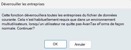 Sélectionnez Déverrouiller toutes les entreprises dans la base de données à partir du menu Entreprise. Utilisez cette fonction lorsqu’un message d’erreur indique qu’une entreprise est verrouillée par un utilisateur qui n’utilise pas actuellement l’entreprise; une telle erreur peut survenir si un ordinateur a cessé de fonctionner pendant l’exécution d’eForms. Il vous sera demandé de confirmer le déverrouillage.