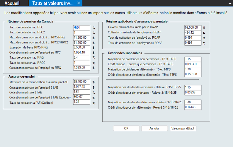 Cliquez sur le bouton Par défaut pour rétablir tous les taux et toutes les valeurs invariables à leurs valeurs prévues par la loi pour 2026.