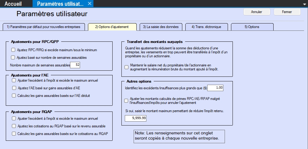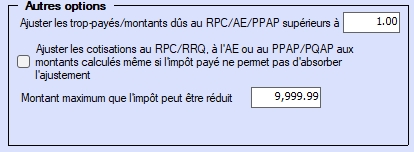 Ajuster les différences RPC/AE/RPAP supérieures à - Des ajustements au RPC/RRQ, à l’AE ou au RPAP/RQAP seront effectués seulement s’ils dépassent la valeur saisie ici. Aucun ajustement ne sera effectué si l’écart entre le montant calculé et le montant saisi pour le RPC/RRQ, l’AE ou le RPAP/RQAP est inférieur ou égal à cette valeur, et les valeurs non ajustées seront indiquées. La valeur par défaut est de 1,00 $.