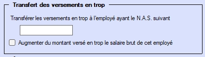 Augmenter la rémunération brute de l’employé ci‑dessus du montant du versement en trop - Si les ajustements créent un versement en trop et que celui‑ci est transféré à un bénéficiaire précis, vous pouvez aussi augmenter la rémunération brute de ce bénéficiaire afin de maintenir le même niveau de rémunération nette. Si cette option est choisie et que le RPC/RRQ du cessionnaire est inférieur à la cotisation maximale de l’année, le RPC/RRQ ne sera PAS ajusté de nouveau pour ce montant insuffisant.