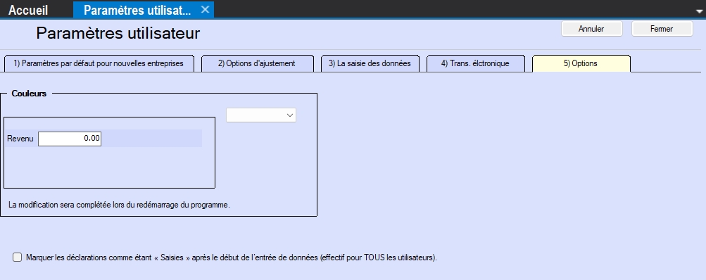 Marquer les déclarations comme « Saisie commencée » au début de la saisie des données (en vigueur pour TOUS les utilisateurs) - Définit l’État de production des déclarations sur « Saisie commencée » lorsque des données sont saisies dans N’IMPORTE QUEL feuillet ou formulaire sommaire de cette entreprise